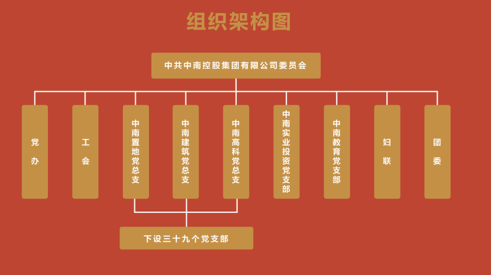 1988年,中共中南控股集團有限公司黨支部成立,2002年升級為中共中南控股集團有限公司黨總支,2007年6月,成立中共中南控股集團有限公司委員會。目前公司黨委下設2個黨總支,39個黨支部,655名黨員。